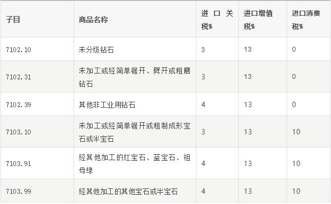 根據(jù)2019年4月1日起實施的增值稅降稅政策及《進出口稅則對照使用手冊(2019版)》,寶石進口時應繳納關稅、增值稅和消費稅,稅率分別為: