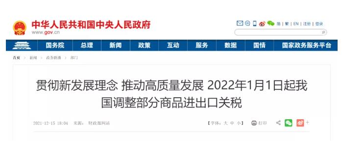 經(jīng)國務院批準,國務院關稅稅則委員會印發(fā)通知,2022年將調(diào)整部分商品的進出口關稅。為完整、準確、全面貫徹新發(fā)展理念,支持構建新發(fā)展格局,繼續(xù)推動高質(zhì)量發(fā)展,經(jīng)國務院批準,國務院關稅稅則委員會印發(fā)通知,2022年將調(diào)整部分商品的進出口關稅。