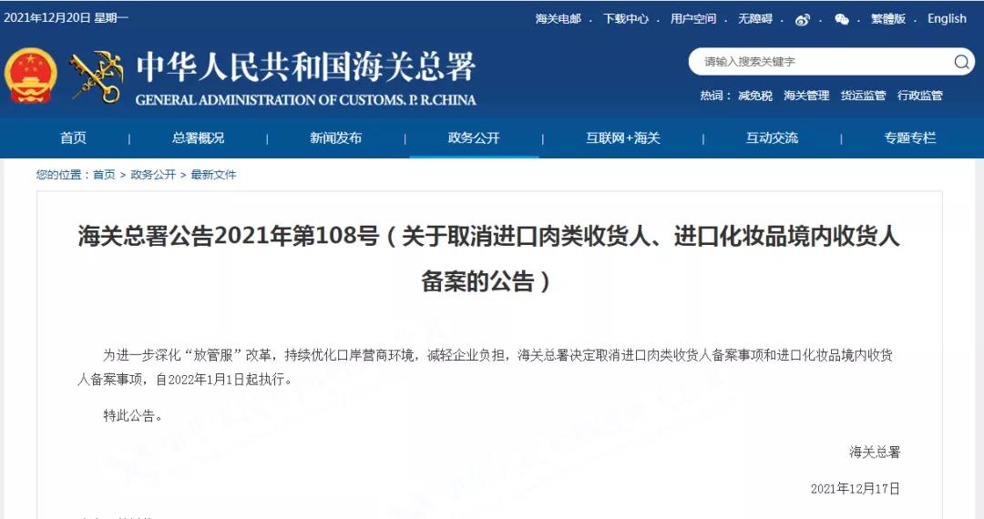 2021年12月17日,海關(guān)總署發(fā)布2021年第108號公告:為進(jìn)一步深化“放管服”改革,持續(xù)優(yōu)化口岸營商環(huán)境,減輕企業(yè)負(fù)擔(dān),海關(guān)總署決定取消進(jìn)口肉類收貨人備案事項和進(jìn)口化妝品境內(nèi)收貨人備案事項,自2022年1月1日起執(zhí)行。