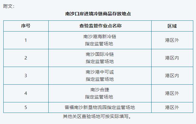 三、南沙國際冷鏈指定監(jiān)管場地計劃于10月25日開展冷鏈查驗作業(yè),但目前暫不具備凍肉和冰鮮水產(chǎn)品指定監(jiān)管場地資質(zhì),因此進(jìn)口這兩種冷鏈產(chǎn)品的企業(yè)在填寫“貨物存放地點”時,不得填寫南沙國際冷鏈指定監(jiān)管場地作為“貨物存放地點”,其他冷鏈產(chǎn)品按第二條要求執(zhí)行。