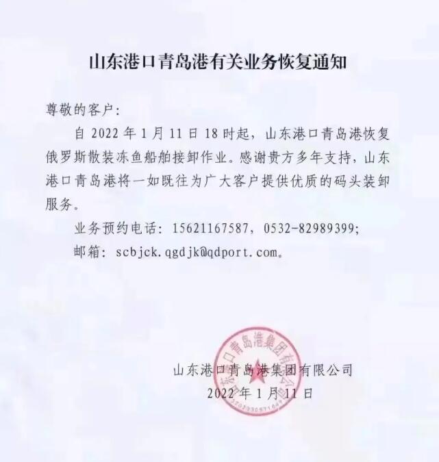 青島港也宣布重新對俄羅斯散貨船開放,2022狹鱈供應(yīng)有望緩解!