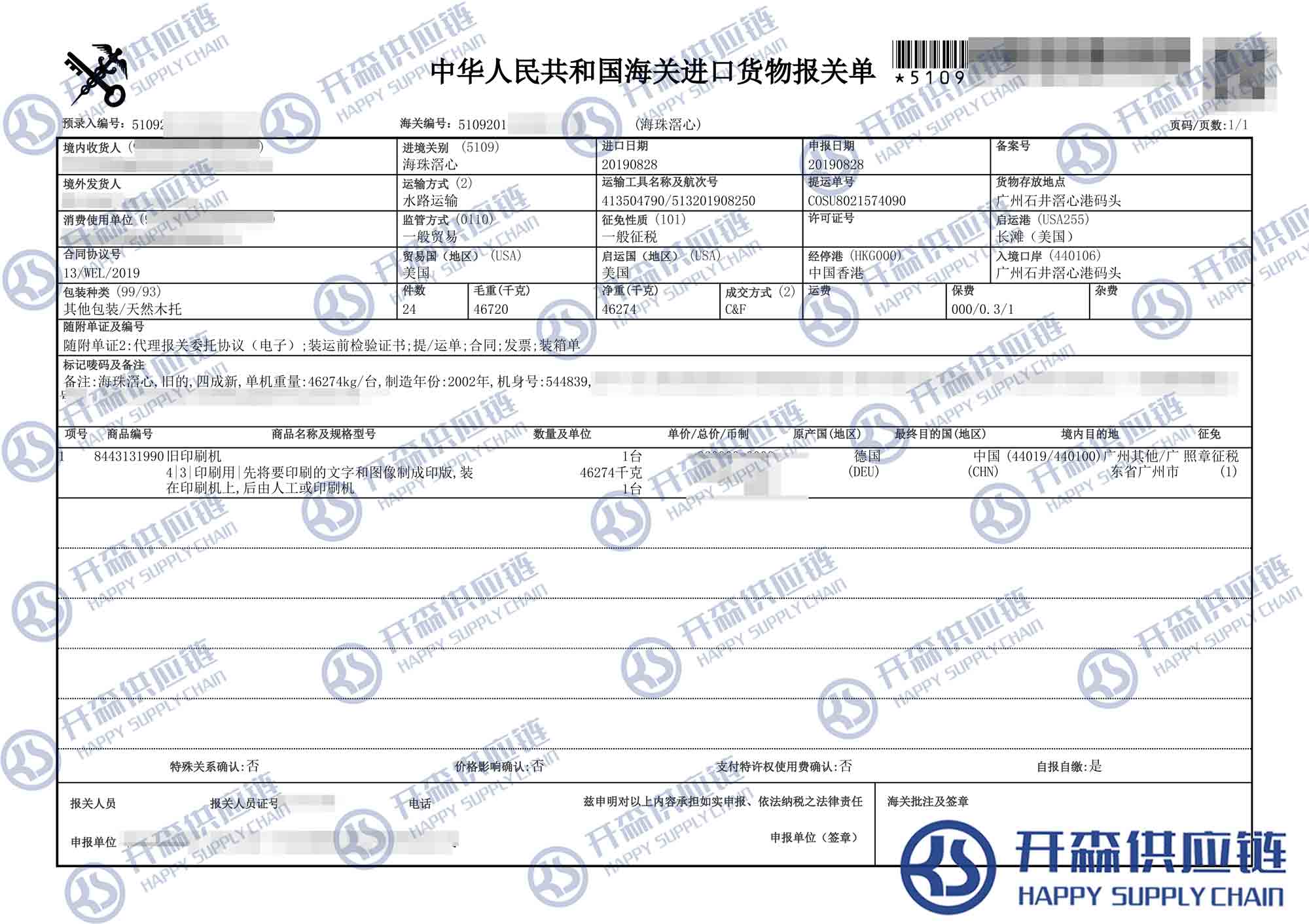 開(kāi)森進(jìn)口供應(yīng)鏈擁有豐富二手舊機(jī)械設(shè)備進(jìn)口操作經(jīng)驗(yàn)及案例,經(jīng)常在廣東,上海,香港等主要港口操作機(jī)械進(jìn)口報(bào)關(guān)項(xiàng)目,報(bào)關(guān)代理為主要業(yè)務(wù),專業(yè)從事機(jī)械進(jìn)口海運(yùn)、報(bào)檢、報(bào)關(guān)、倉(cāng)儲(chǔ)、物流配送等一系列進(jìn)口清關(guān)業(yè)務(wù)。