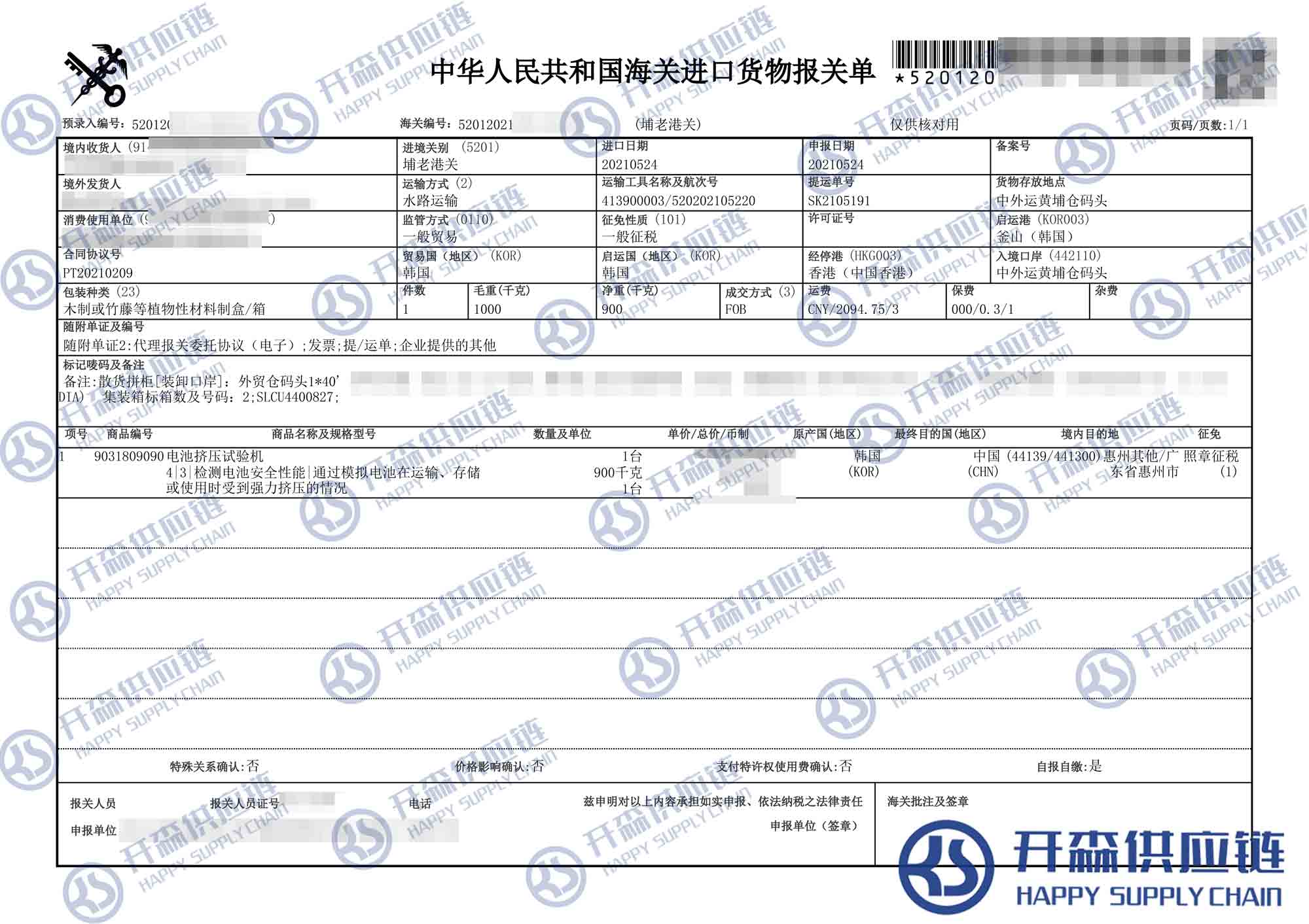 【導讀】您正在閱讀的是關于韓國電池擠壓試驗機進口報關代理服務【進口案例】的內(nèi)容,本文由開森機械進口報關代理小編整理編寫;