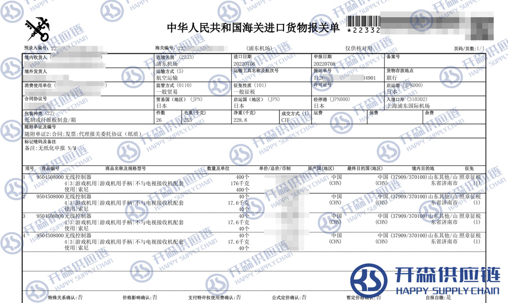 【本文結(jié)語】 上述就是日本游戲手柄進口清關報關代理服務【經(jīng)典案例】的全部內(nèi)容,希望能對您有所幫助,如有游戲機進口報關上任何疑問及問題可隨時在線聯(lián)系我們或撥打 18002611553,開森供應鏈擁有豐富的游戲機進口報關操作經(jīng)驗及案例,10余年進口經(jīng)驗為您所用,各類進口疑難都能為您一一解答及協(xié)助快速處理解決!