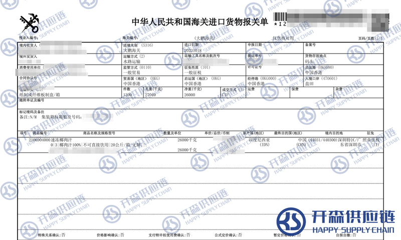 一、香港速凍椰肉汁進(jìn)口報(bào)關(guān)代理案例詳情
