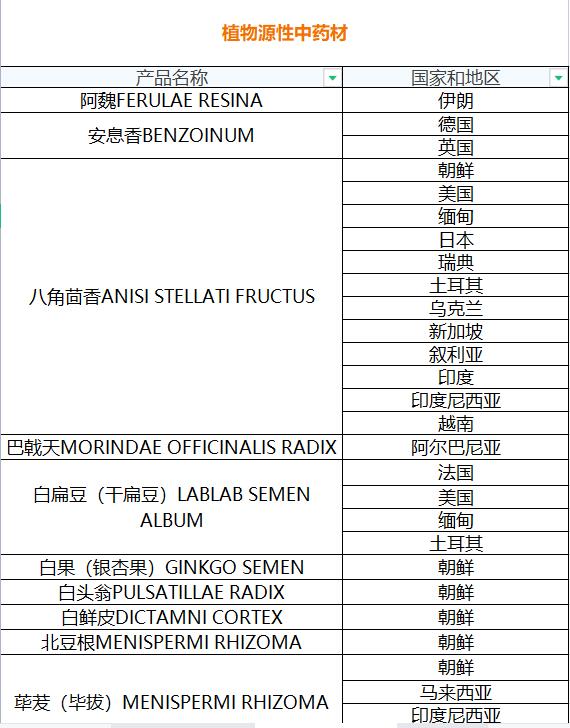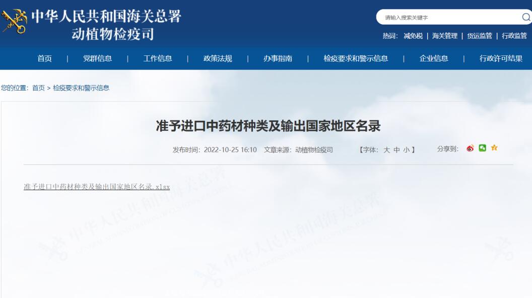 海關(guān)總署對(duì)進(jìn)境中藥材實(shí)施檢疫準(zhǔn)入制度,包括產(chǎn)品風(fēng)險(xiǎn)分析、監(jiān)管體系評(píng)估與審查、確定檢疫要求、境外生產(chǎn)企業(yè)注冊(cè)登記以及進(jìn)境檢疫等。目前,我國(guó)已準(zhǔn)予91個(gè)國(guó)家、地區(qū)的上百種中藥材,企業(yè)可在海關(guān)總署—?jiǎng)又参餀z疫司—檢疫要求和警示信息(http://dzs.customs.gov.cn/dzs/2746776/4445554/index.html)查詢準(zhǔn)予進(jìn)口中藥材種類及輸出國(guó)家地區(qū)名錄信息(也可咨詢開森供應(yīng)鏈,我們將為您提供最新詳細(xì)名單目錄)
